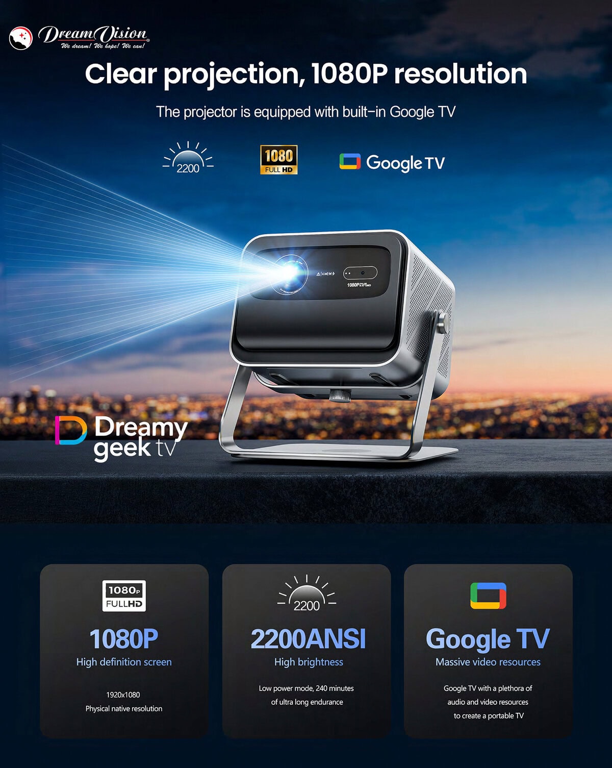 These features are highlighted in the product brochure visuals such as 1080P resolution, Google TV integration, and 2200 ANSI brightness.
